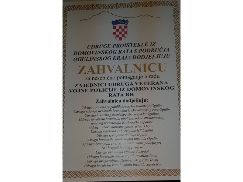 Dodijeljene su zahvalnice za potporu i pomaganje u radu udruge, a zahvalnice su dobili Grad Ogulin, Općina Tounj, Tomislav Lipošćak, Bolnica Ogulin, DVD Ribarići, Zajednica udruga veterana vojne policije Domovinskog rata.