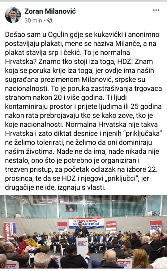 “Nakon jučerašnjih izjava SDP-ovog predsjedničkog kandidata Zorana Milanovića u Ogulinu, a koje je prenesao dio medija, jednostavno moramo reagirati i najoštrije osuditi ovakvu retoriku.