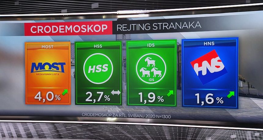 Ostale stranke i opcije ne prelaze izborni prag. Most, koji pregovara o koaliranju sa Škorom je na 4 posto. HSS, koji na izbore izlazi sa SDP-om, je na 2,7 posto, a ispod 2 posto su i IDS (1,9 posto) i HNS (1,6 posto).