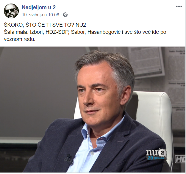 Gostovanje Miroslava Škore u “Nedjeljom u 2” najavljeno je u utorak u 10:08 sati, a u 19:31 sati istog dana objavljeno je da je gostovanje otkazano.