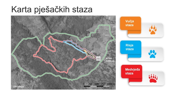 Ove staze, koje posjetitelje vode kroz zaštićeni krajobraz okolice Baraćevih špilja, nose imena zvjeri koje obitavaju u ovim krajevima: Vuka, Risa i Medvjeda.