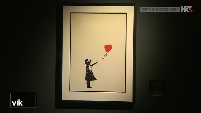 Među njima i otisak ‘Djevojke s balonom’ – slike koja je prije dvije godine na jednoj aukciji prodana za 1,2 milijuna funta, a odmah nakon prodaje djelo se samouništilo. Autor je navodno u okvir ugradio rezač papira koji je uništio platno.