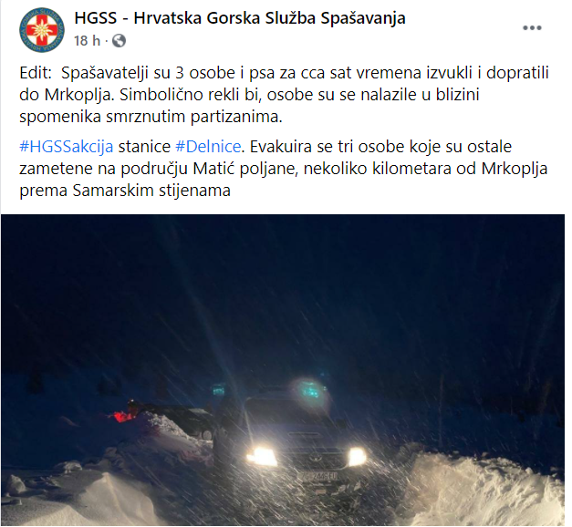 Pripadnici Hrvatske gorske službe spašavanja (HGSS) spasili su u nedjelju tri osobe i psa koji su bili zameteni na području Matić poljane, nekoliko kilometara od Mrkoplja prema Samarskim stijenama.