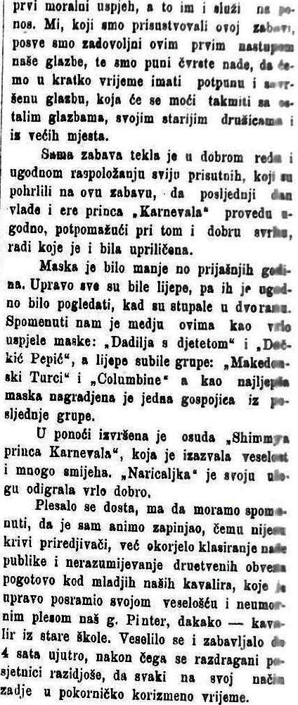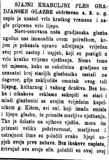Tjednik “Glas Hrvata” u svom izdanju od 8. ožujka 1924. godine donosi članak o pokladnoj zabavi, a u organizaciji ogulinske građanske glazbe koja je tom prigodom održala svoj prvi nastup.