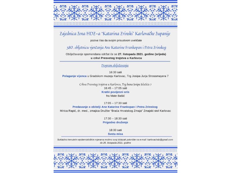 27. listopada 2021. kratkim povijesnim orisom fra. Mate Bašića u crkvi Presvetoga trojstva u Karlovcu obilježit će se 380. obljetnica vjenčanja Ane Katarine Frankopan i Petra Zrinskoga.