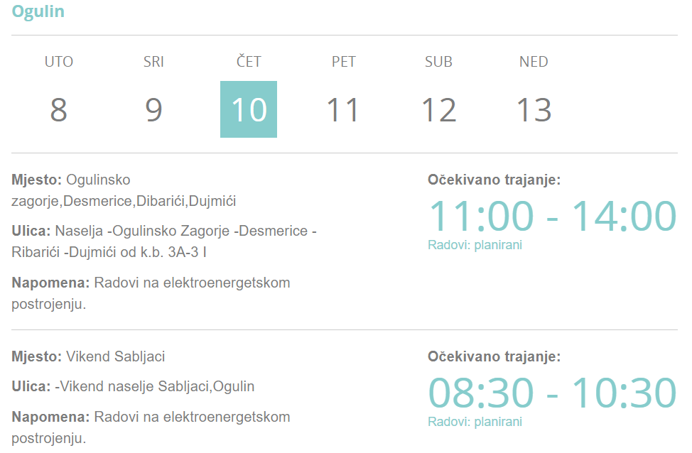 Ogulinsko Zagorje, Desmerice, Ribarići, Dujmići od 11 do 14 sati bit će danas, 10. ožujka bez struje dok će radovi i obustava u Vikend Naselju Sabljaci biti od 8 do 10:30, javljaju iz HEP-a.