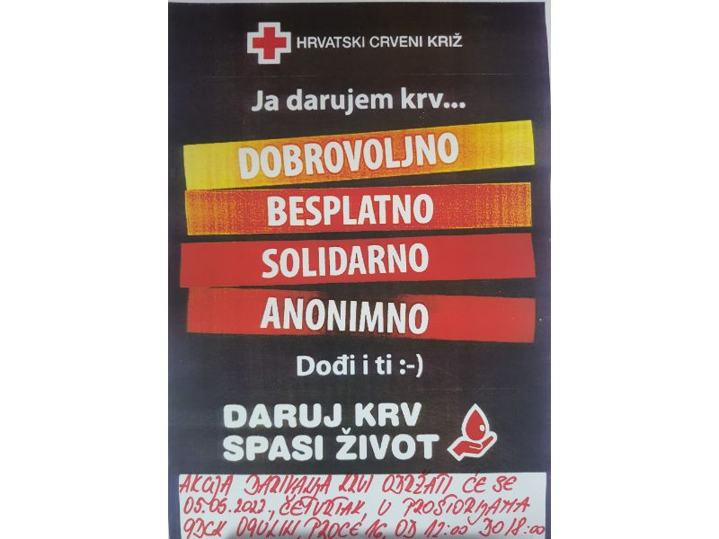 I ovaj četvrtak, 5.5.2022., u Gradskom društvu Crvenoga križa Ogulin, na adresi Proce 16, od 12 do 18 sati održat će se akcija darivanja krvi.