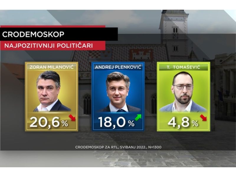RTL televizija je objavila nove podatke CRO Demoskopa o rejtingu stranaka i političara u svibnju. Promjene u odnosu na prošli mjesec nisu drastične, ali prema podacima posljednji sukob dva vodeća političara u državi naštetio je predsjedniku Zoranu Milanoviću.