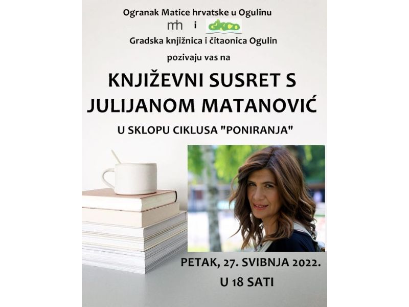 Književni susret s Julijanom Matanović u sklopu ciklusa “Poniranja” održat će se u petak 27. svibnja 2022. s početkom u 18 sati u prostoru velike dvorane Gradske knjižnice i čitaonice Ogulin.