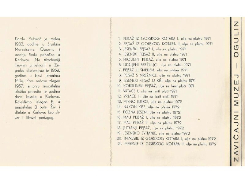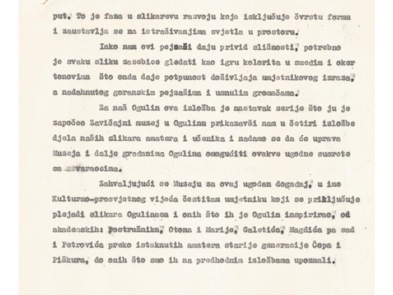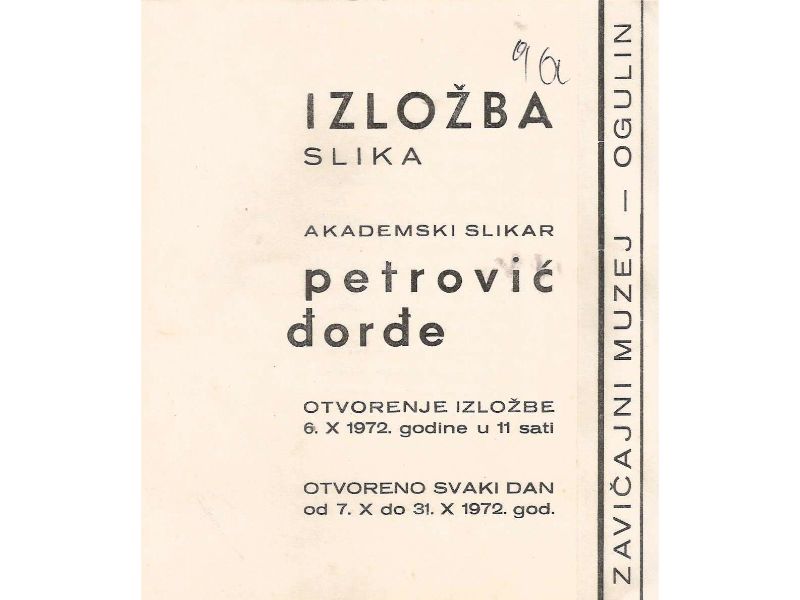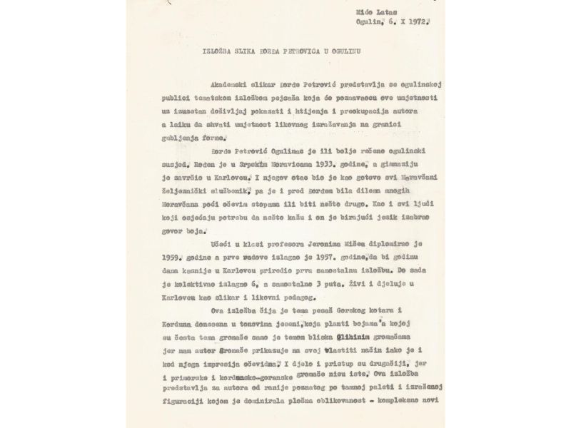 Danas se u rubrici „Utorkom iz muzejskog arhiva“ prisjećamo izložbe akademskog slikara Đorđa Petrovića, koji se predstavio ogulinskoj publici izložbom pejzaža 6. listopada 1972. godine u Zavičajnom muzeju Ogulin.