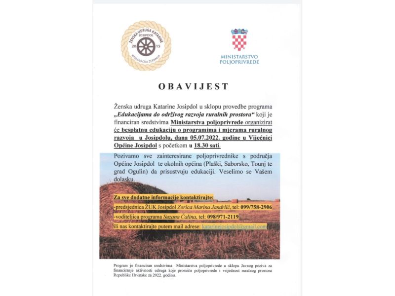 Ženska udruga Katarine Josipdol 5. srpnja, u 18:30 u Vijećnici Općine Josipdol organizirat će besplatnu edukaciju o programima i mjerama ruralnog razvoja.