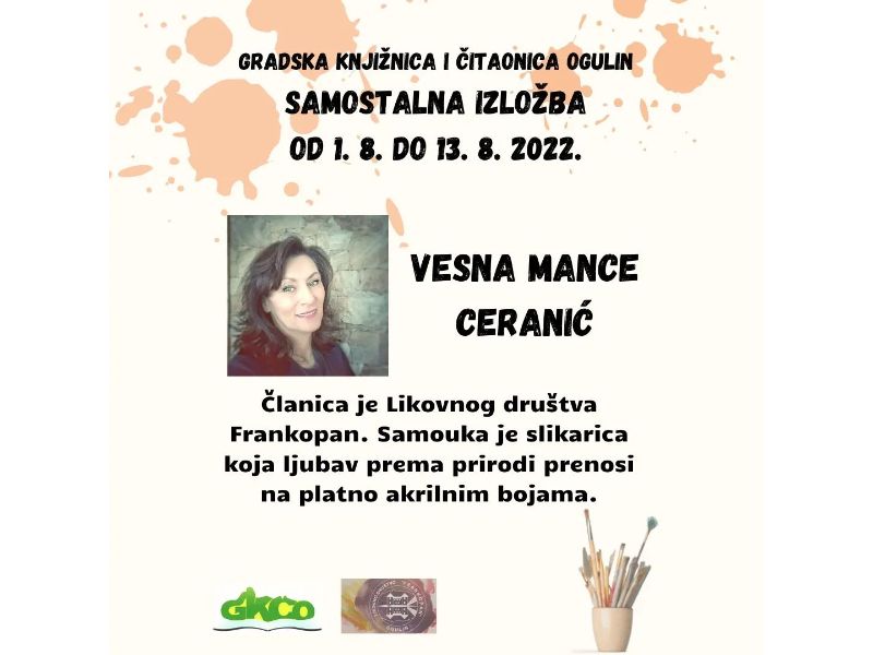 Ovaj tjedan, u Gradskoj knjižnici i čitaonici Ogulin od 1. kolovoza do 13. kolovoza izloženi su umjetnički radovi Vesne Mance Ceranić, članice Likovnog društva Frankopan Ogulin.