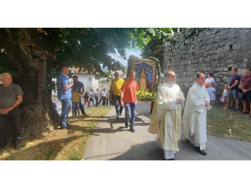 „20 dana u godini su spomendani Blažene djevice Marije što dovoljno govori o njenoj važnosti, a četiri se posebno slave, 1. siječnja Marija Bogorodica, 25. ožujka Navještenje BDM, 8. prosinca Bezgrešno začeće BDM te kao najveći blagdan 15. kolovoza Uznesenje BDM kao najjače otajstvo naše vjere kada ju je Gospod uznio na nebo dušom i tijelom,“ istaknuo je na početku propovjednik don Goran Antunović te nastavio: „Marija je žena zaodjenuta suncem, mjesec joj pod nogama na glavi joj vijenac od 12 zvijezda. Kao što je Marija došla u posjet Elizabeti i mi smo danas došli Mariji. Marija je Elizabeti donijela Boga, a u utrobama je došlo do susreta Ivana i Isusa. To je poziv da i mi u susretu s bližnjima zaigramo našom dušom. Zapitajmo se koliko smo mi božje sredstvo da po nama Krist dolazi drugima. Upravo nas ova svetkovina poziva da budemo božje sredstvo. Teško je povjerovati u uznesenje, no to je otajstvo naše vjere, a mi danas ne slavimo smrt nego život i božje kraljevstvo. U Marijinoj „veliča duša moja Gospodina“ vidi se njena zahvalnost i njena vjera kada Bogu kaže „da“. Ona ima predivne osobine poniznosti i neznatnosti. Što smo ponizniji, to smo Bogu draži,“ zaključio je don Goran Antunović te poručio da otvorimo svoje srce poput Marije da kažemo Bogu „da“.