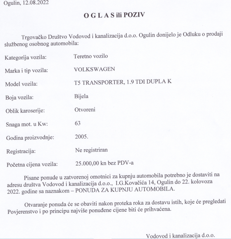 Na stranicama Vodovoda Ogulin može se sada pronaći oglas za samo jedno teretno vozilo. Riječ je o Volkswagenu T5 transporter, 2005 godište.