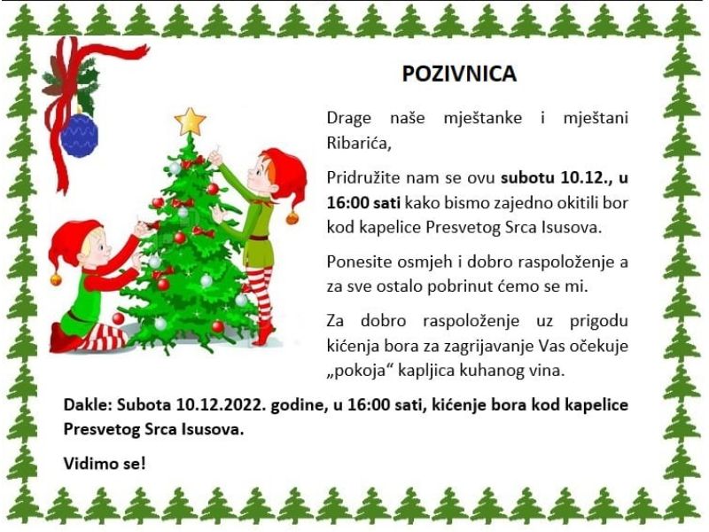 Iz MO Ribarići pozivaju mještane na prigodno druženje i kićenja bora 10. prosinca kod kapelice Presvetoga Srca Isusova.