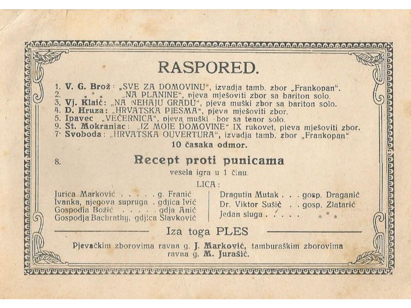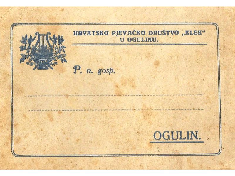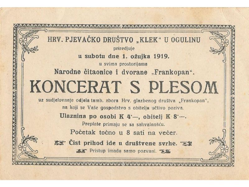 Ovog utorka u našoj rubrici „Utorkom iz muzejskog arhiva“ predstavljamo pozivnicu s rasporedom programa za koncert s plesom Hrvatskog pjevačkog društva Klek koji je održan 1. ožujka 1919. godine u prostoru Narodne čitaonice i dvorane „Frankopan”.