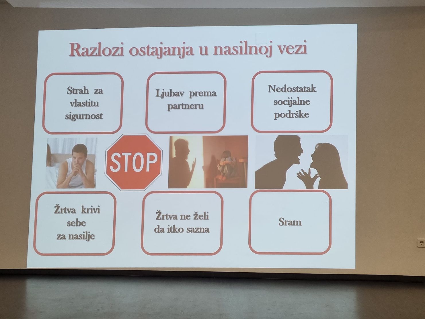 Predavačica Sara Salopek, studentica 3.godine Fakulteta za matematiku, Sveučilišta u Rijeci, ukazala je prisutnima na problem nasilja u adolescentnim vezama bilo da se radi o fizičkom, psihičkom, socijalnom, financijskom, seksualnom ili internetskom nasilju jednog od partnera u vezama mladih.