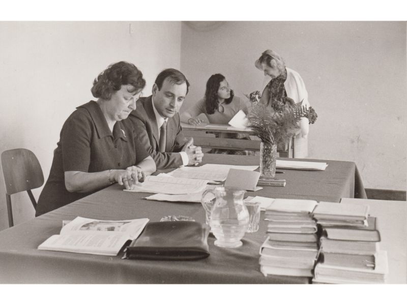 Fotografija: Polaganje mature pred povjerenstvom, lipanj 1974., profesori Gollner, Tironi, Horački, izvor – osobna zbirka I.Tironija