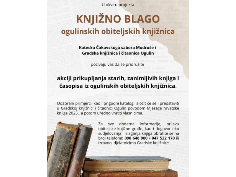 Katedra Čakavskoga sabora Modruše i Gradska knjižnica i čitaonica Ogulin u okviru projekta Knjižno blago ogulinskih obiteljskih knjižnica prikupljaju stare, zanimljive knjige i časopise iz ogulinskih obiteljskih knjižnica.