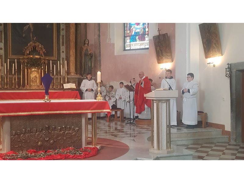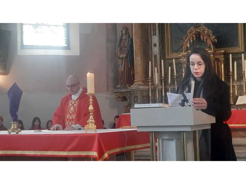 Pjevana je Muka po Mateju, kojeg je interpretirala vjeroučiteljica Inka Salopek, Isusa župnik Nikola Prša a ostale likove članovi zbora, Marin Mićunović je bio Pilat, Krnoslav Brajdić veliki svećenik, Silvija Vučić Juda. Vlč. Prša je u nastavku poručio da svi promislimo o Isusovoj žrtvi i tako se najbolje pripremimo za ulazak u Veliki tjedan. Na koncu mise prinesene su Caritasove kutijice najmlađih u sklopu korizmenog odricanja te akcije Misereor 2023. s kuvertama župljana za uzdržavanje biskupijskih ustanova koje će župnik Prša prinijeti gospićko-senjskom biskupu Križiću na misu posvete ulja u gospićkoj katedrali na Veliku srijedu.