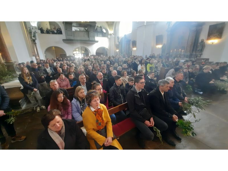 Na blagdan Cvjetnice ili nedjelje Muke Gospodnje misno slavlje predslavio je u župi sv. Križa u Ogulinu župnik vlč. Nikola Prša dok je korizmenim napjevima misu animirao župni zbor pod vodstvom i uz orguljsku pratnju Marina Mičunovića. Slavlje vazmenog otajstva započelo je blagoslovom maslinovih grančica u dvorištu župe, nakon čega se svečani ophod uputio u župnu crkvu. Okupilo se blizu tisuću vjernika na ovaj dan uoči Velikog tjedna.