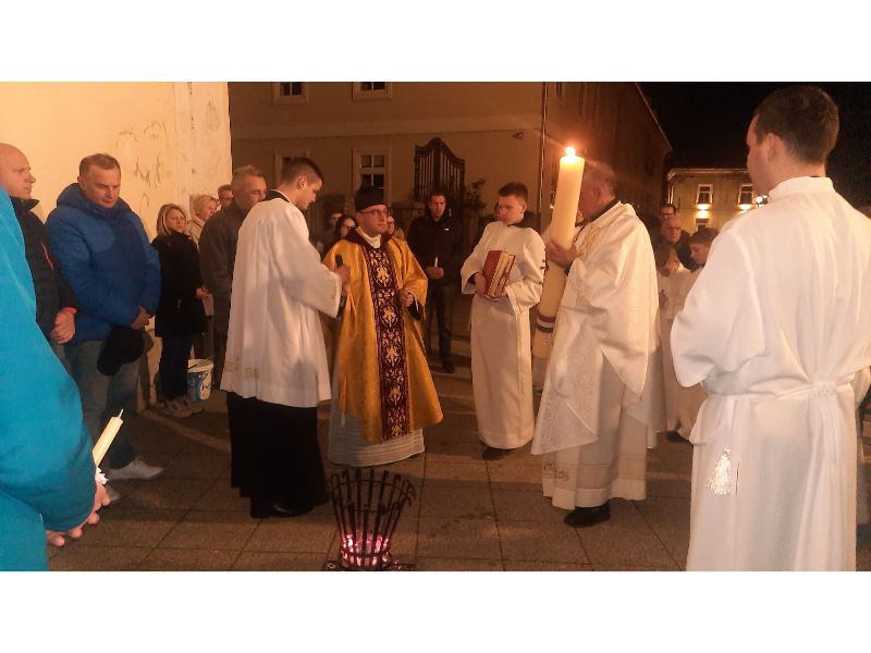 Blagoslov ognja obavljen je u Parku kralja Tomislava ispred crkve nakon čega su svećenici s blagoslovljenom svijećom, simbolom uskrsnog Krista u procesiji ušli u crkvu. Na uskrsnu svijeću koju je držao župni vikar upisana su grčka slova alfa i omega i pet Isusovih rana. Tada se ušlo u crkvu čime je započela Služba riječi uz čitanje 5 čitanja 3 iz Starog i 2 iz Novog zavjeta. Uz pjevanje Slave, s glavne svijeće ponovo su se zapalile sve svijeće vjernika u crkvi. Zatim je slijedila homilija.
