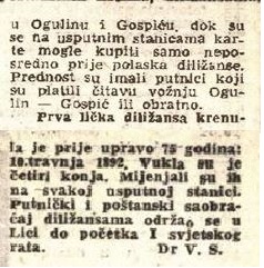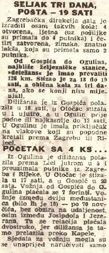 Sličan oblik prijevoza pošte i putnika kočijama između Gospića i Ogulina uveden je 10. travnja 1892. godine, zalaganjem Šandora Vučetića, ravnatelja zagrebačke direkcije pošta. Prijevoz diližansama (franc.diligence, skraćeno od voiture de diligence ili carrosse de diligence: brza kočija) na relaciji od Gospića do Ogulina dugoj 126 km trajao je između 18 i 19 sati, za razliku od običnih kola kojima je trebalo tri dana, ako se konji nisu mijenjali.