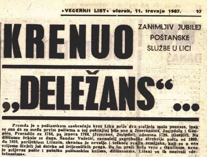 Ovom prigodom u našoj rubrici donosimo članak iz Večernjeg lista objavljen 11. travnja 1967. godine o poštanskoj službi u Lici.