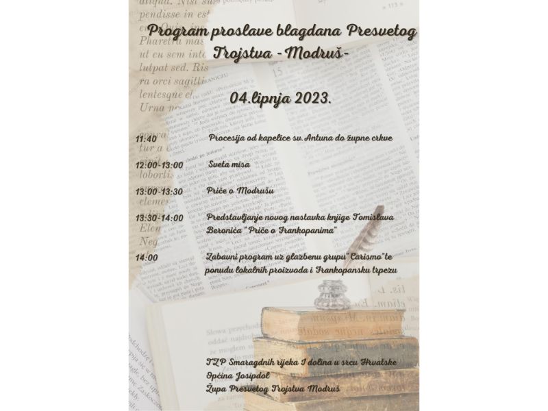 Turistička zajednica područja Smaragdnih rijeka i dolina u Srcu Hrvatske u suradnji s Općinom Josipdol i župom Presvetog Trojstva Modruš organizira proslavu blagdana Presvetog Trojstva na Modrušu.
