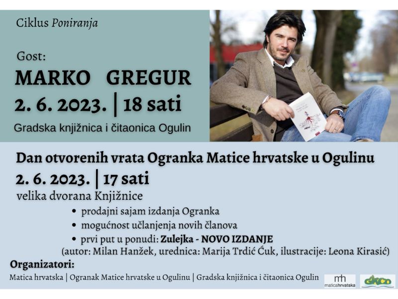 U okviru ciklusa “Poniranja” Gradska knjižnica i čitaonica Ogulin i Ogranak Matice hrvatske u Ogulinu organiziraju Književni susret s književnikom Markom Gregurom 2. lipnja (petak), u 18 sati. Susret će moderirati Doroteja Palijan.