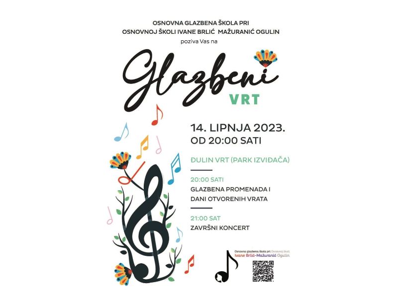 “Glazbeni vrt 2023” u organizaciji Osnovne glazbene škole pri OŠ Ivane Brlić-Mažuranić Ogulin održat će se u srijedu 14.6.2023. s početkomu 20 sati u Đulinom vrtu.