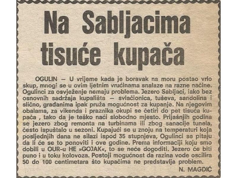 O popularnosti i prihvaćenosti jezera Sabljaci od strane Ogulinaca u prošlosti, pored sjećanja starijih sugrađana, svjedoče i novinski zapisi. Jedan takav zapis, autora Nebojše Magdića, Zavičajni muzej Ogulin donosi u svojoj rubrici „Utorkom iz muzejskog arhiva”.