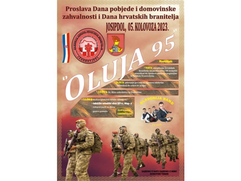 Zajednica udruga hrvatskih branitelja Ogulina, Tounja, Josipdola, Plaškoga i Saborskog, Općina Josipdol u suradnji s Turističkom zajednicom područja Smaragdnih rijeka i dolina u srcu Hrvatske 05. kolovoza 2023. organizira obilježavanje Dana pobjede i domovinske zahvalnosti i Dan hrvatskih branitelja u Josipdolu.