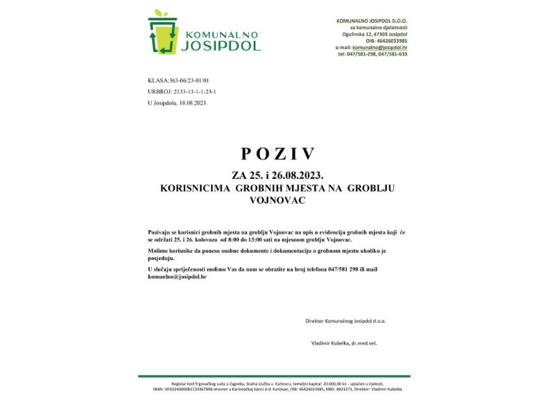 Komunalno Josipdol poziva korisnike grobnog mjesta na groblju Vojnovac.