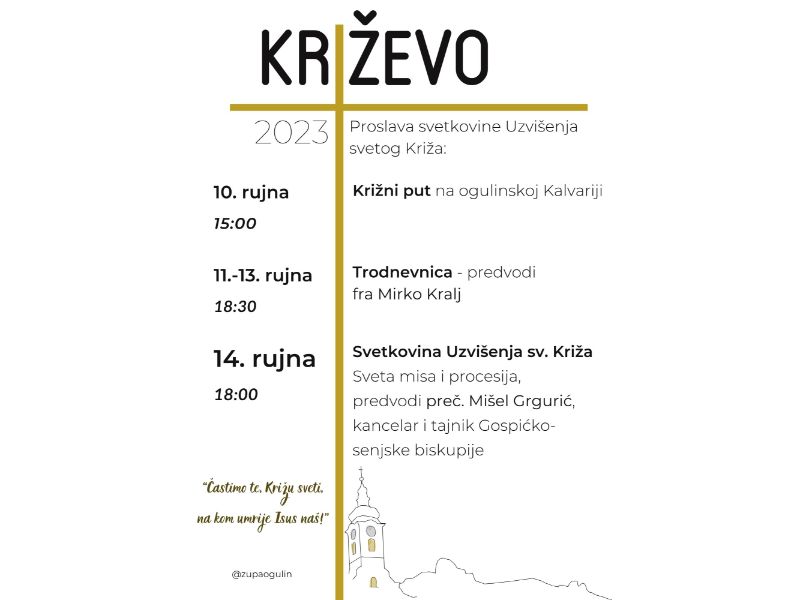 Slavlje župnog patrona Uzvišenja Svetoga Križa u Ogulinu započinje u nedjelju, 10. rujna Križnim putem na Ogulinskoj kalvariji u 15 sati. Od 11. do 13 rujna trodnevnicu će redvoditi fra Mirko Kralj.
