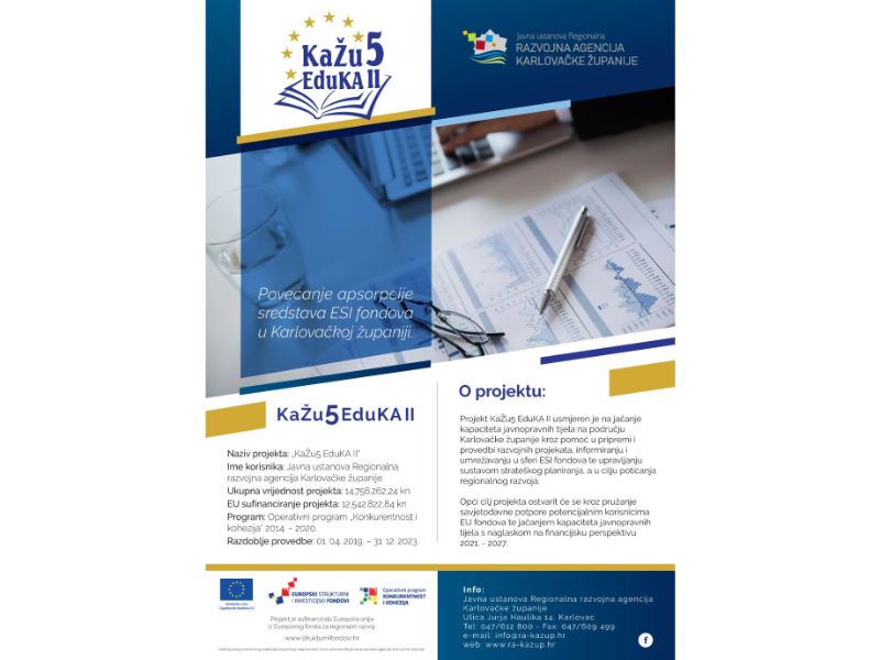 projekt KaŽu5 EduKA II Javna ustanova Regionalna razvojna agencija JURRA u Karlovačkoj županiji provodi od 2019. godine, a njime su općine, gradovi i javne ustanove Karlovačke županije educirani za prijavu projekata iz fondova EU.