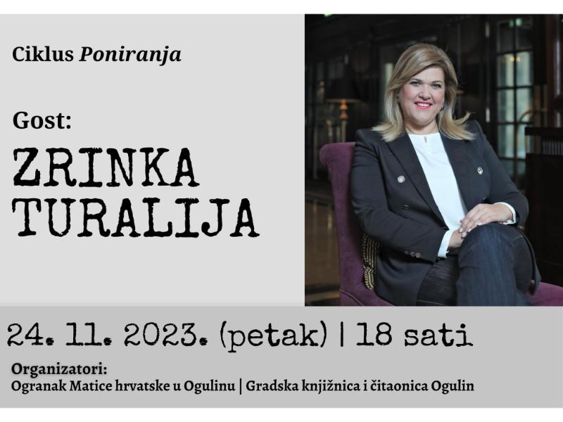 Ogranak Matice hrvatske u Ogulinu i Gradska knjižnica i čitaonica Ogulin pozivaju vas u petak, 24. 11. 2023. u 18 h na susret u okviru ciklusa “Poniranja”. Gošća je urednica i televizijska voditeljica Zrinka Turalija.