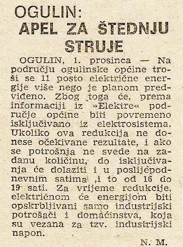U našoj rubrici „Utorkom iz muzejskog arhiva” donosimo članke iz Novog lista o redukcijama struje na području Ogulina. Članci su objavljeni u studenom i prosincu 1981. godine. Autor članaka je Nebojša Magdić.