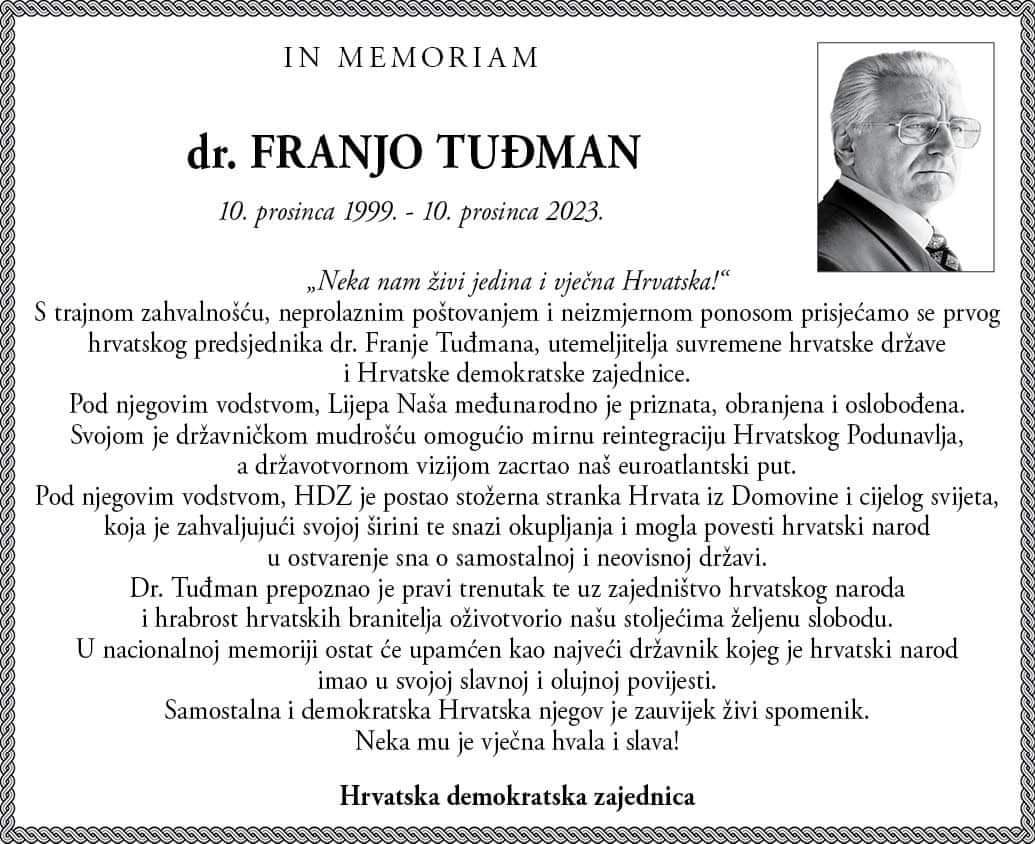 Predsjednika Tuđmana prisjećamo se sa zahvalnošću, velikim poštovanjem i neizmjernim ponosom. Slobodna Hrvatska njegov je trajni spomenik. U nacionalnom će sjećanju ostati upamćen kao najveći državnik kojeg je hrvatski narod imao u svojoj slavnoj i olujnoj povijesti.