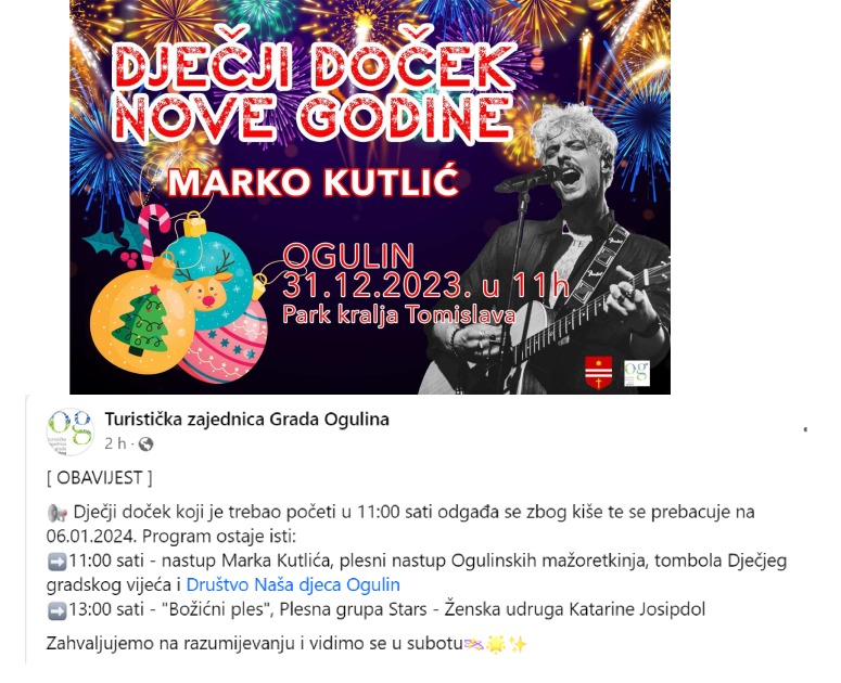 Dječji doček nove godine koji se trebao održati danas s početkom u 11:00 sati Turistička zajednica Grada Ogulina odgodila je zbog kiše i prebacila za iduću subotu 6.1.2024.g.