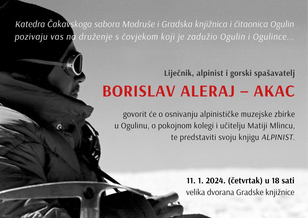 Katedra Čakavskoga sabora Modruše i Gradska knjižnica i čitaonica Ogulin pozivaju vas na druženje s Borislavom Alerajom u četvrtak 11.1.2024.g u velikoj dvorani Gradske knjižnice s početkom u 18 sati.
