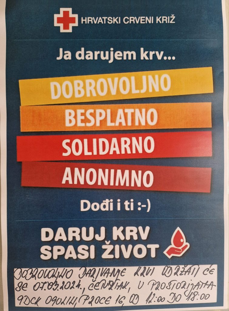 Akcija će se održati sutra, 07.03.2024., u vremenu od 12:00 do 18:00 sati na adresi Proce 16. Pozivamo sve zdrave građane dobrog srca da iskažu svoju solidarnost i učine besplatnu i anonimnu donaciju krvi koja može spasiti živote.