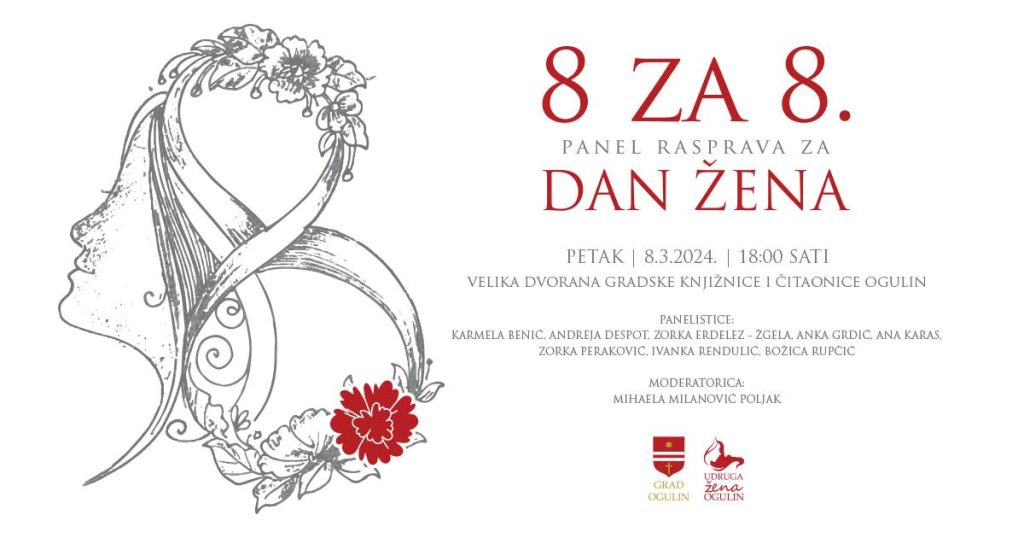 U duhu proslave Međunarodnog dana žena, Grad Ogulin zajedno s Udrugom žena Ogulin najavljuje svoj treći godišnji događaj “8 za 8”, panel raspravu posvećenu posebno ovom značajnom danu. Ove godine, događaj će biti održan 8. ožujka u 18 sati u Velikoj dvorani Gradske knjižnice i čitaonice Ogulin, čime se nastavlja tradicija osnaživanja ženskog glasa i zajedništva.