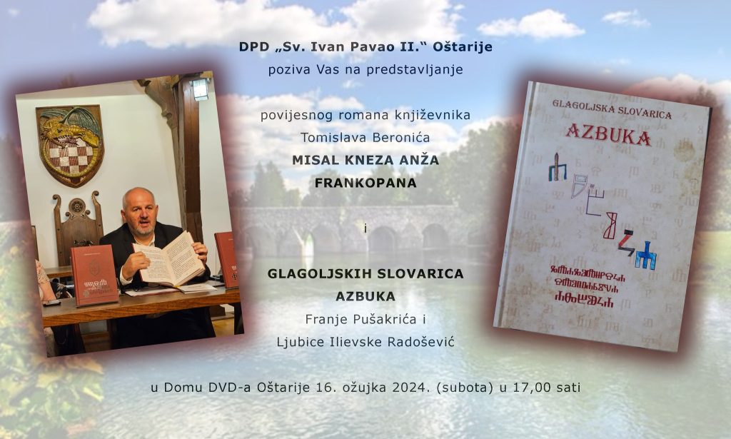 U subotu, 16. ožujka 2024., pozivamo Vas na zanimljivo predstavljanje povijesnog romana književnika Tomislava Beronića “Misal kneza Anža Frankopana” u Domu DVD-a Oštarije.