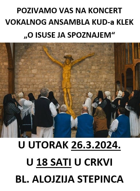 U utorak, 26. ožujka 2024. godine, u crkvi blaženog Alojzija Stepinca, s početkom u 18 sati, održat će se koncert duhovne glazbe koji nosi naslov “O Isuse ja spoznajem”. Poznati vokalni ansambl Kulturno-umjetničkog društva “Klek” poziva sve ljubitelje glazbe i duhovnosti da se pridruže ovom jedinstvenom glazbenom događaju.