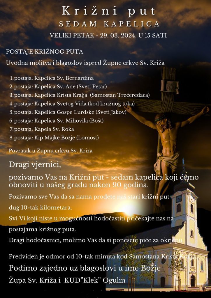 Uz zvuke zvona Župne crkve Sv. Križa, u 15 sati na Veliki petak, vjernici će se okupiti kako bi započeli “Križni put – Sedam kapelica”, procesiju koja simbolizira Isusov put na Kalvariju. Ova obnova križnog puta, prvi put nakon više od 90 godina, prilika je za građane da zajedno prođu stari križni put dužine oko desetak kilometara.