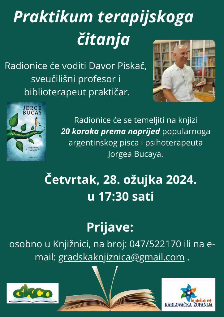 Radionice, koje počinju 28. ožujka 2024. u 17:30 sati, vodit će izvanredni profesor dr. sc. Davor Piskač, priznati stručnjak s bogatim iskustvom u području biblioterapije. Sudionici će imati priliku raditi na knjizi “20 koraka prema naprijed” Jorgea Bucaya, koja se ističe svojom sposobnošću da kroz priče i anegdote nudi uvide u važne korake za poboljšanje osobnog života i odnosa s drugima.