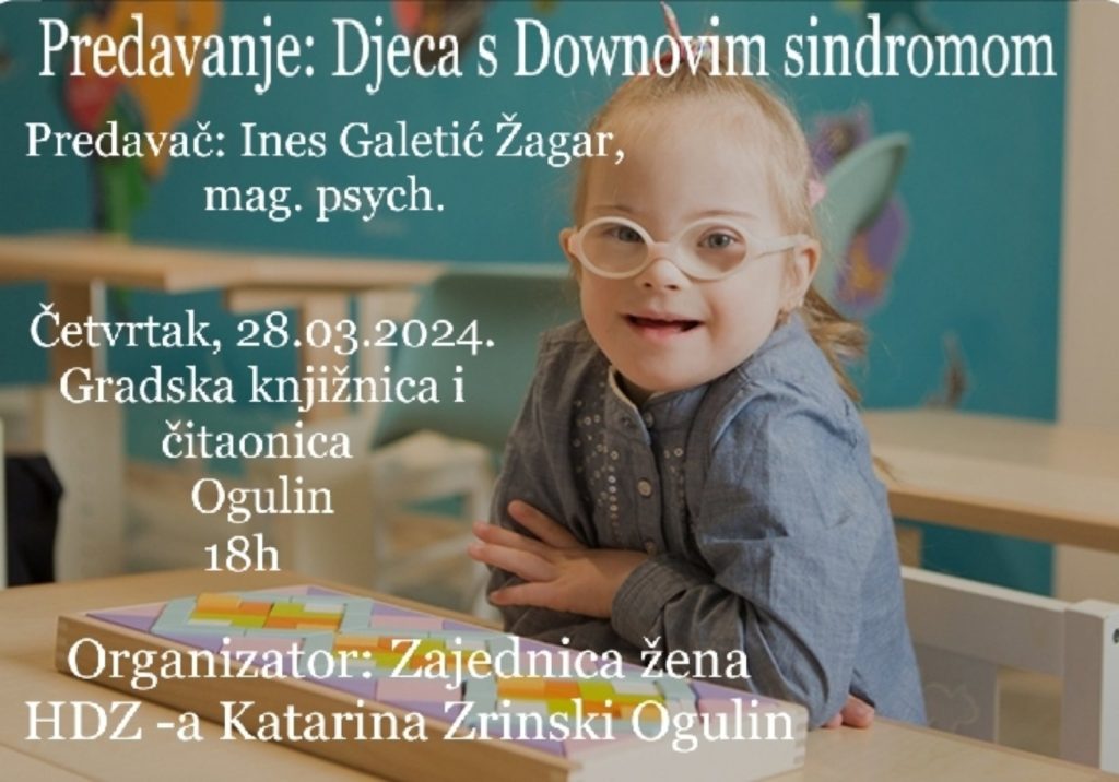 U Ogulinu će se ovog četvrtka, 28. ožujka 2024., održati predavanje pod nazivom “Djeca s Downovim sindromom”, za koje je predviđeno i prikazivanje dokumentarnog filma “Djeca ljubavi”. Predavanje, koje počinje u 18 sati u Gradskoj knjižnici i čitaonici, vodit će psihologinja Ines Galetić Žagar, magistra psihologije.