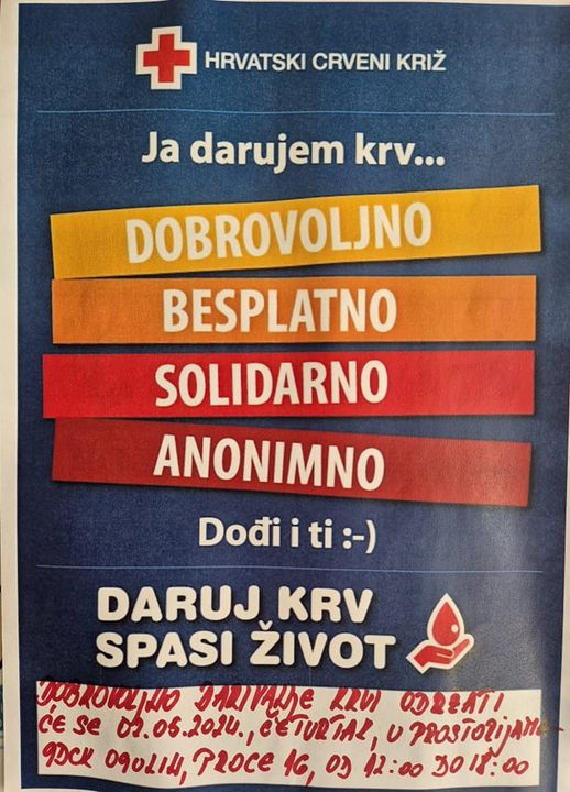 U četvrtak, 2. svibnja 2024., od 12:00 do 18:00 sati na adresi Proce 16, održat će se akcija dobrovoljnog darivanja krvi pod pokroviteljstvom Hrvatskog Crvenog križa. Ova humanitarna aktivnost naglašava važnost dobrovoljnog, besplatnog, solidarnog i anonimnog darivanja krvi, s ciljem spašavanja života i pomoći onima u potrebi.