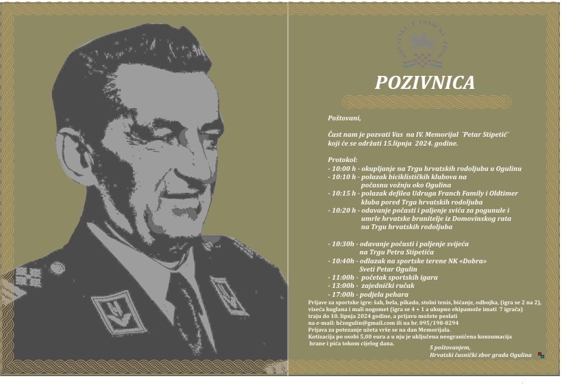 Ogulin će 15. lipnja 2024. godine biti domaćin IV. Memorijala “Petar Stipetić”, događaja posvećenog jednom od najznačajnijih hrvatskih generala. Organizatori pozivaju sve zainteresirane građane da se pridruže ovoj manifestaciji.